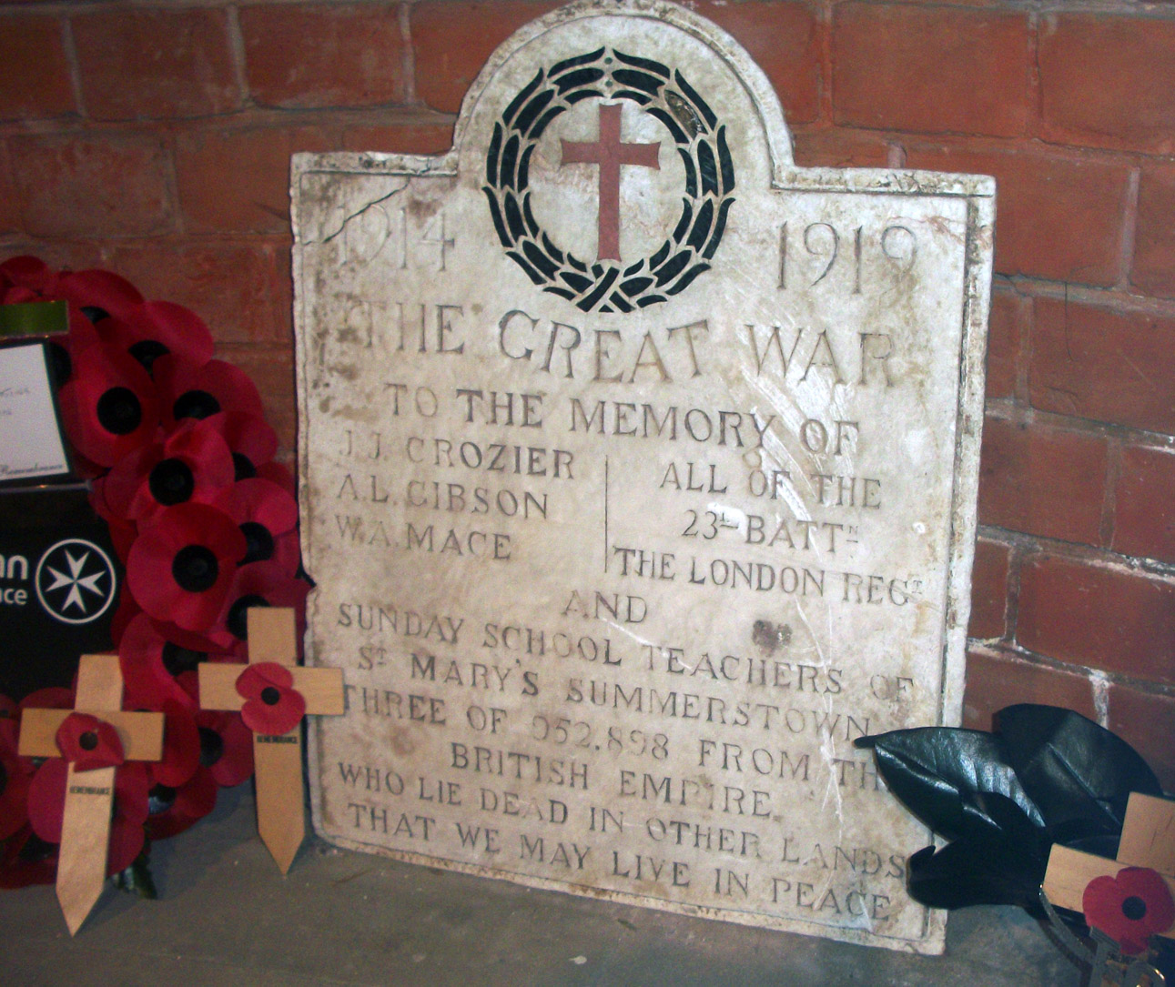 Its exactly one year since the story about the tribute to William Clay appeared in the Wandsworth Guardian and triggered the momentum which kick-started this project. The research began with the three Sunday School teachers whose names are on the main memorial but also commemorated separately on a white marble and alabaster tablet. Reverend Roger Ryan famously retrieved this from a heap of compost in the vicarage garden shortly after taking charge of the parish. It is now in the process of being cleaned up and restored. How extraordinary and perfectly apt that this week we should make contact with Alison Milton, related to not just one of the Sunday School Three, William Mace, but two other members of the Summerstown182. It has been a momentous few days and we now have photographs of William Mace and Thomas Milton, the RAF mechanic whom we have cheekily christened ‘The Balloon Man’. To know a little bit about these men, to have written something about them and now suddenly learn a great deal more and see what they look like, is a chastening experience. All of us involved in the project feel particularly blessed this week. A little bit of very precious treasure has been unearthed. It all started when Christine and Marion got to work on a soldier called James Chenery whose Commonwealth War Graves Commission record connects him to 34 Bendon Valley. This is on the north side of Summerstown, where Garratt Lane passes Earlsfield Station and twists past the massive Henry Prince Estate on its way towards Wandsworth. Adjoining this are three roads leading down to the River Wandle which were once all lined with terraced houses; Bendon Valley, Lydden Road and Wardley Street. With a strong romany presence, it was a tough neighbourhood with a reputation for lawlessness. Today, only a few houses survive and the area is a mess of light industrial units and small factory spaces. No34 is probably under the immense box-like Mecca Bingo Hall which sprung up a few years ago. There is also a used tyre yard which looks like it would have been a very good location for a punch-up in The Sweeney. To cap it all, at the end of the road is the site of the original Airfix factory. James might have been born too early to see any little plastic soldiers or aeroplanes being made, but he would surely have seen the steady stream of worn-out nags heading for the Harrison Barber knacker’s yard. The biggest one in London, 26,000 horses a year were turned into cat-meat at this location. James was born, the fifth of nine children at 16 Lydden Road on 10th October 1891. Amazingly I’m writing this on his birthday. His father was a carman who died in 1909. Perhaps as a result of that James went into the army, because the 1911 census shows that he was a Rifleman in the Kings Royal Rifle Corps, stationed in Gosport, Hampshire. Meanwhile the family moved around, relocating to Fulham for a while before settling at 58 Wimbledon Road, then Huntspill Street and finally Bendon Valley. James entered France in December 1914 with the 7th Battalion of the Kings Royal Rifle Corps and was promoted to Lance Corporal. In July 1915 they fought at Hooge Crater, being the first division to be attacked with flamethrowers. By 1916 he was a Sergeant and the date of his death, 25th August 1916, indicates that he died in the defence of a place called Delville Wood on the Somme. Between 17th and 26th his battalion fought the Germans at Orchard and Brewery trenches, sustaining 99 fatalities. One of the most horrific battles of the First World War, characterised by ferocious hand-to-hand fighting with bayonets, ‘Devil’s Wood’ is the South African equivalent of Gallipoli and the location of their national war memorial. Along with eleven other members of the Summerstown182, James is one of 75,000 names on the Thiepval Memorial. Visible from many miles away, it bestrides the gentle pastoral landscape on the Somme, and is possibly the grandest war memorial ever built. James’ mother was a Mary Ann Milton and her nephew Frederick Forrester Milton, although not one of the Summerstown182, plays a key role in their story. Also in the Kings Royal Rifle Corps, the Churchman’s Battalion, he was seriously wounded in 1916. The following year, after six months recuperation he married Kate Victoria Mace at St Mary’s Church on 7th July 1917. She was the sister of Sunday School teacher, William and the couple lived at his old home at 39 Huntspill Street. Until they left the parish in 1930, the Miltons, both Sunday School teachers themselves, played a prominent role in parish life at the church. Frederick was heavily involved in raising money for the war memorial, and after it was built, a special role for them was ensuring a regular supply of fresh flowers for it. On it were the names of his brother Thomas Milton and brother-in-law William Mace, not to mention so many others he would have known. Christine got in touch with Alison through a genealogy website. She has told us that the daughter of her Uncle Fred and Aunt Vic (pictured below), a lady called Dora, aged 93, is alive and resident in Worthing. The niece of William Alexander Mace! How fine it would be to make a trip there and show her the restored memorial tablet which bears her Uncle’s name.