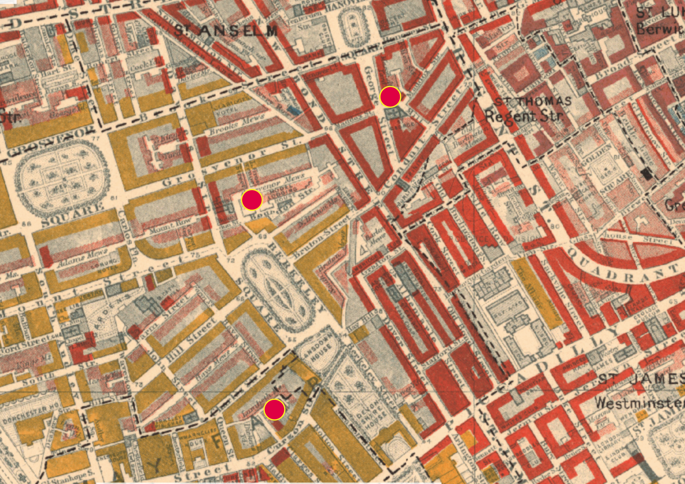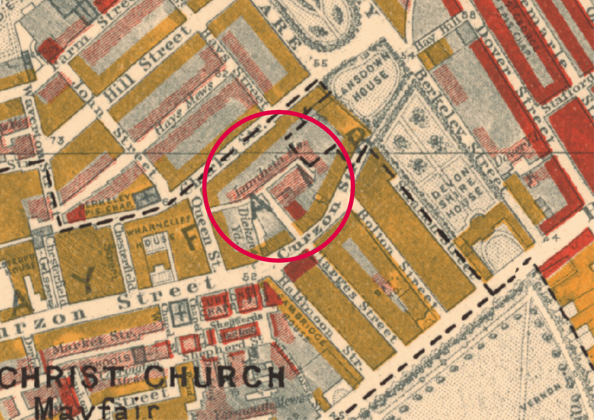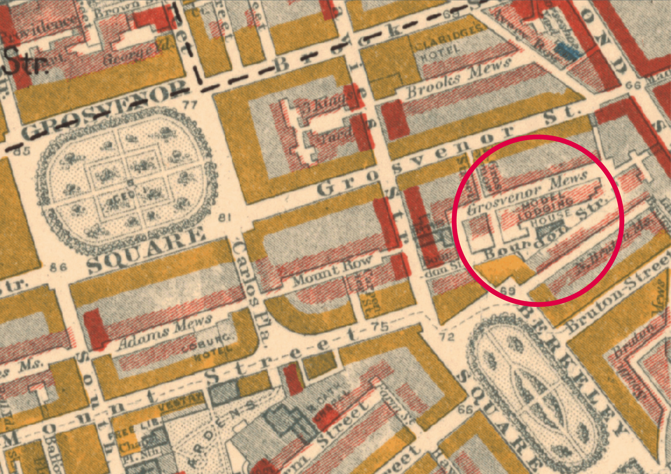 The most expensive spot on the Monopoly board, still today a strange world of gentlemen’s clubs and grand hotels. Growing up surrounded by so much excess would have given young Percy a glimpse of his future life and the kind of people he might encounter on a luxury liner. With many coach-houses, stables and farriers’ shops, Bourdon Street’s population consisted predominantly of people like Adam – coachmen, grooms and those involved with horses and carriages. Charles Booth’s notebook from 1899 reports on the abundance of stables and mentions a ‘Home for Fallen Women’. Just around the corner on Davies Street, Bourdon House was the home of the Duke of Westminster who of course owned most of all this.