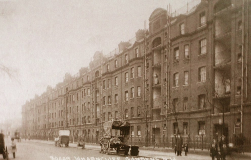 Wharncliffe Gardens was an imposing set of five storey blocks, built in the late nineteenth century to house people whose homes had been swept away by the railway line entering Marylebone Station. It was named after the chairman of the railway company. A Victorian ‘model dwelling’ providing decent accomodation for working-class people, a typical flat had three bedrooms, a sitting room, a kitchen and an inside lavatory. Residents were mainly in regular work with good wages. A V1 rocket killed 33 people and destroyed much of Wharncliffe Gardens in August 1944. A memorial for the victims is in the same cemetery where Adam Fletcher is buried.