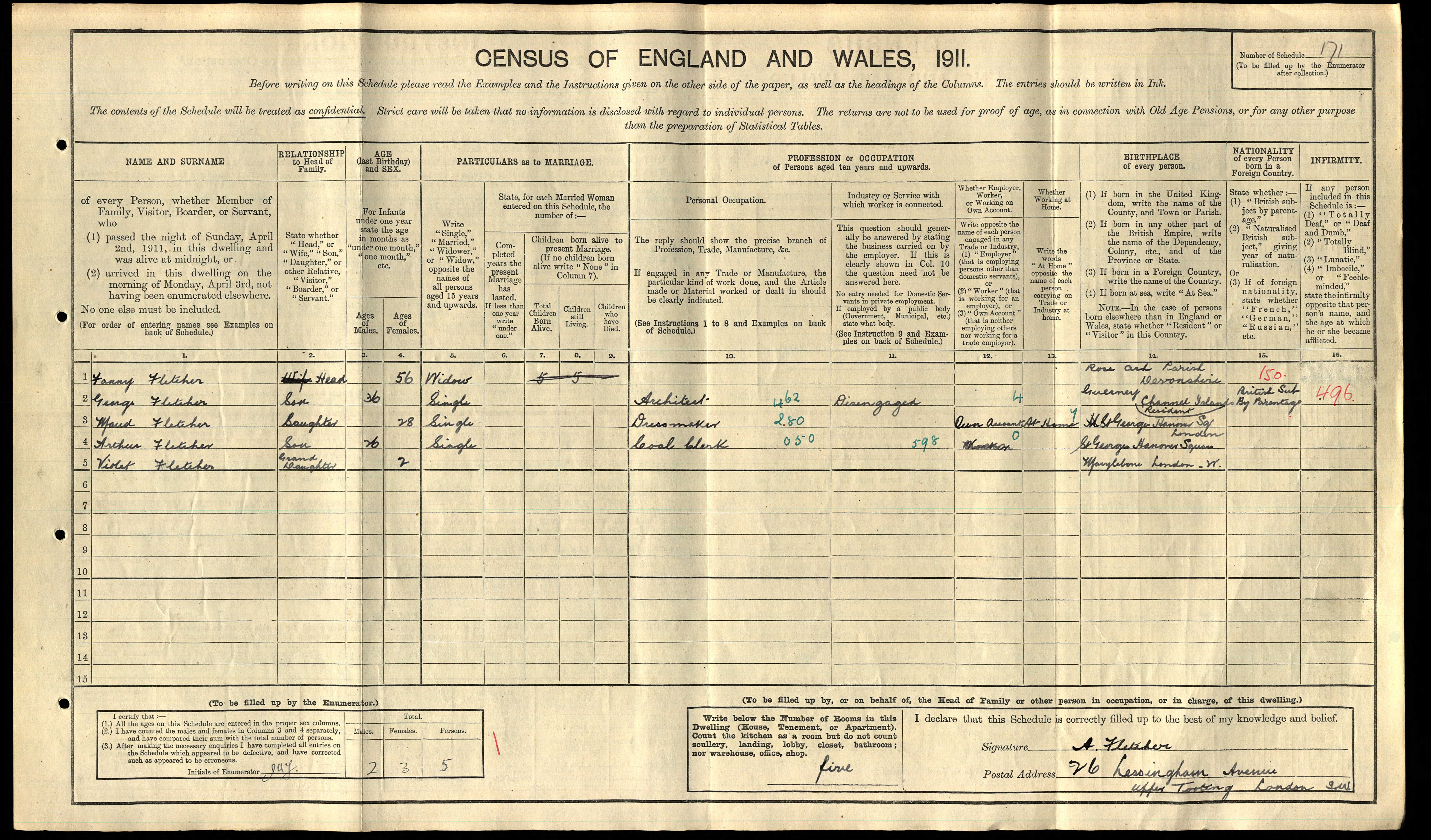 We’re not sure how much longer Fanny lived at 26 Lessingham Avenue but the loss of Percy was followed by further family tragedies which very likely contributed to her ending up at West Park Asylum. Four years of War and grave economic hardships in the twenties would not have made life any easier. We can’t find any records indicating that George or Arthur served in the First World War, though with such a common name and many British records destroyed its possible. Her eldest son George was listed at Lessingham Avenue in 1911 and working an architect’s assistant, though ‘disengaged’ at the time. In the 1921 census he was an inmate at Kensington Workhouse. Arthur, then aged 26 was employed as a coal clerk in 1911. He married Margaret Noonan in December 1912 and a son William was born the following October. Margaret passed away in 1929 and 1939 records pick Arthur up living in 58 Gipsy Road, Lambeth. Also present were William and his wife Vera. Arthur had climbed the ladder and was now a coal depot manager.