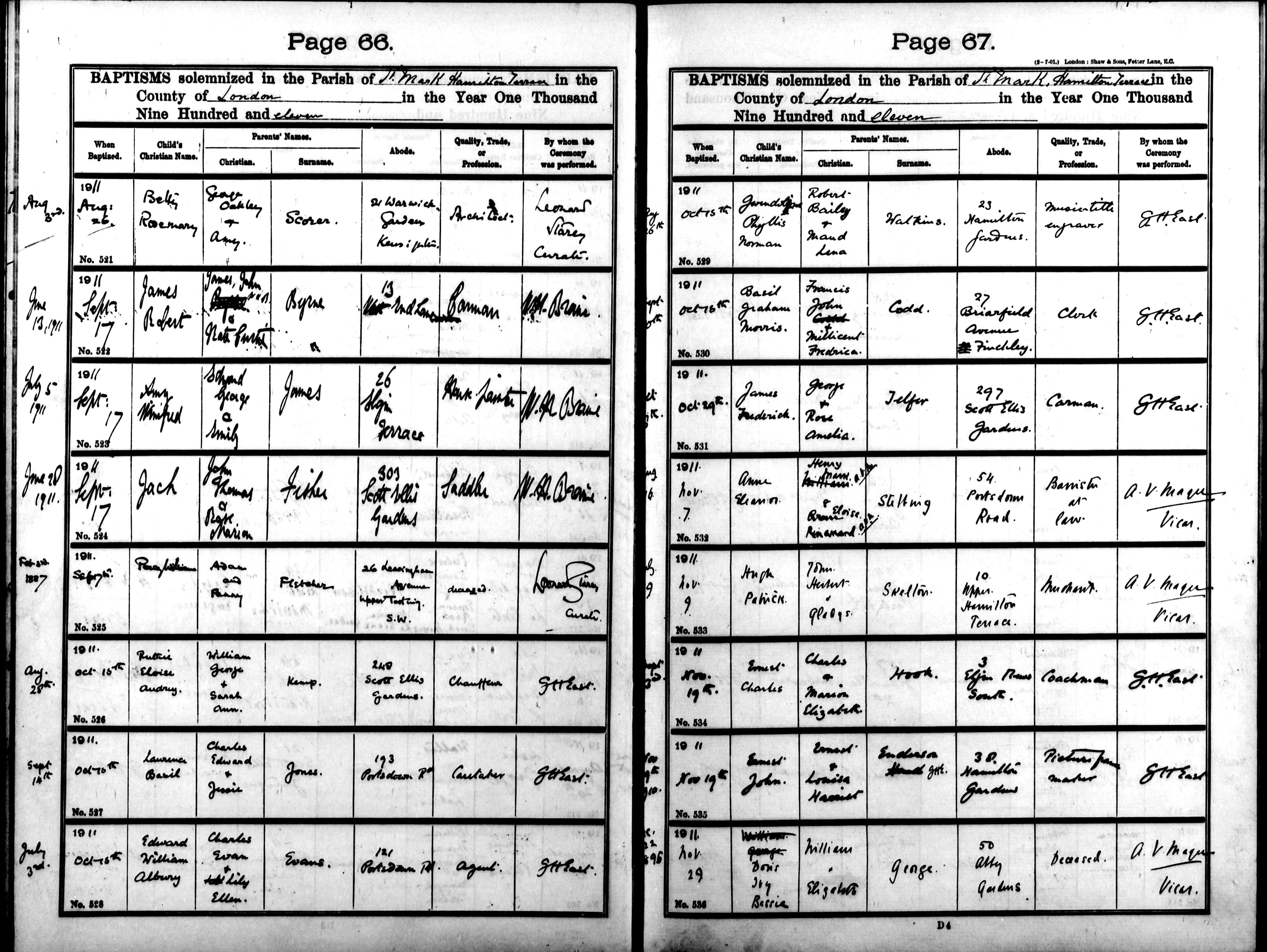 At the age of 24, in September 1911 Percy returned to the St John’s Wood area and was baptised at St Mark’s Church, Hamilton Terrace, just round the corner from where The Beatles crossed Abbey Road. It would have been a short walk up Hamilton Terrace from the old family home at Wharncliffe Gardens. As I write this, very sadly, a fire on the night of 26 January appears to have destroyed much of the 150 year old building.