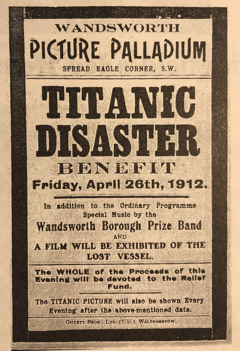 Meanwhile a Titanic Relief Fund started a few weeks later and huge amounts were raised to help dependents. Almost certainly that would have been directed towards Mary rather than Fanny and his siblings at Lessingham Avenue. Another relatively new estate in this area was the Heaver in Balham and the company at 223 Balham High Road produced aluminium medals to give to ‘active workers of the Relief Fund’. Many of these turn up online on various auction sites. They bear the title ‘Help Surpasseth Pity’ with an impression of The Titanic at sea on one side and some statistics on the reverse. The relatively new cinemas in the Tooting and Wandsworth area also raised funds and screened newsreel footage of the disaster. The Broadway Cinematograph Palace had opened its doors just ten days after the sinking and the local newspaper reported it showing ‘a splendid series of pictures relating to the Titanic disaster, including Captain Smith on the Bridge and The Carpathia nearing New York with survivors on board’. There was also footage of icebergs off the coast of Labrador.
